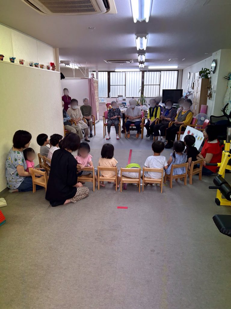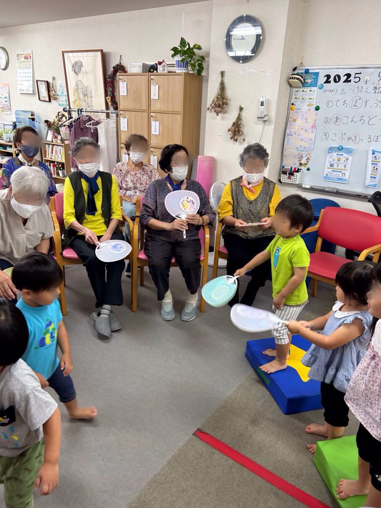 いつも散歩の時に「いってらっしゃーい」とニコニコ笑顔で手を振ってくれるおじいちゃん、おばあちゃん、職員の方が待っていてくれました。初めはドキドキしていた子どもたちでした。