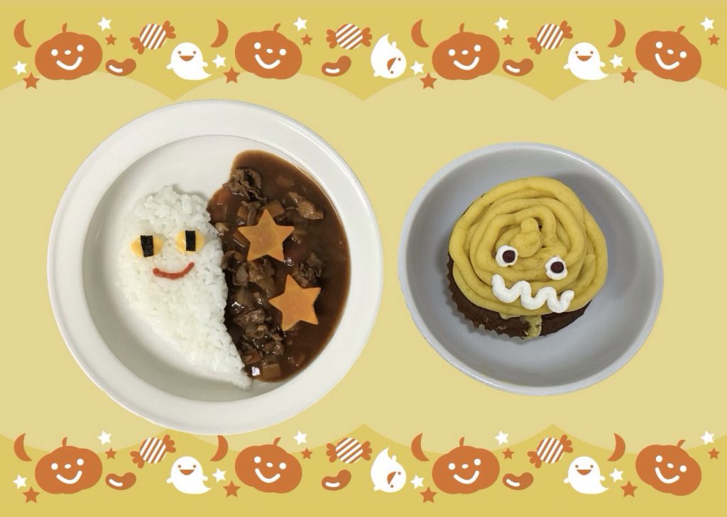 ご飯をおばけに見立てたビーフシチューとお芋のモンブラン👻